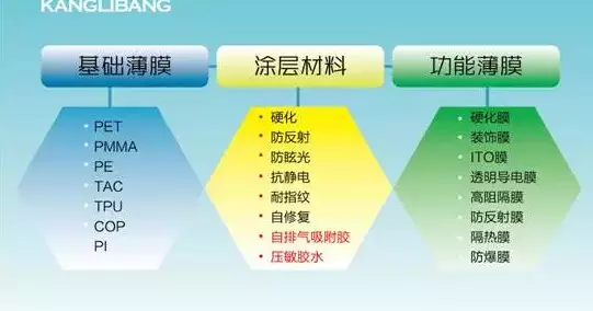根据薄膜功能的不同,要求的涂层材料随之改变,涂层材料有:硬化、防反射、防眩光、抗静电、耐指纹、自修复、自排气吸附胶和压敏胶水等等。